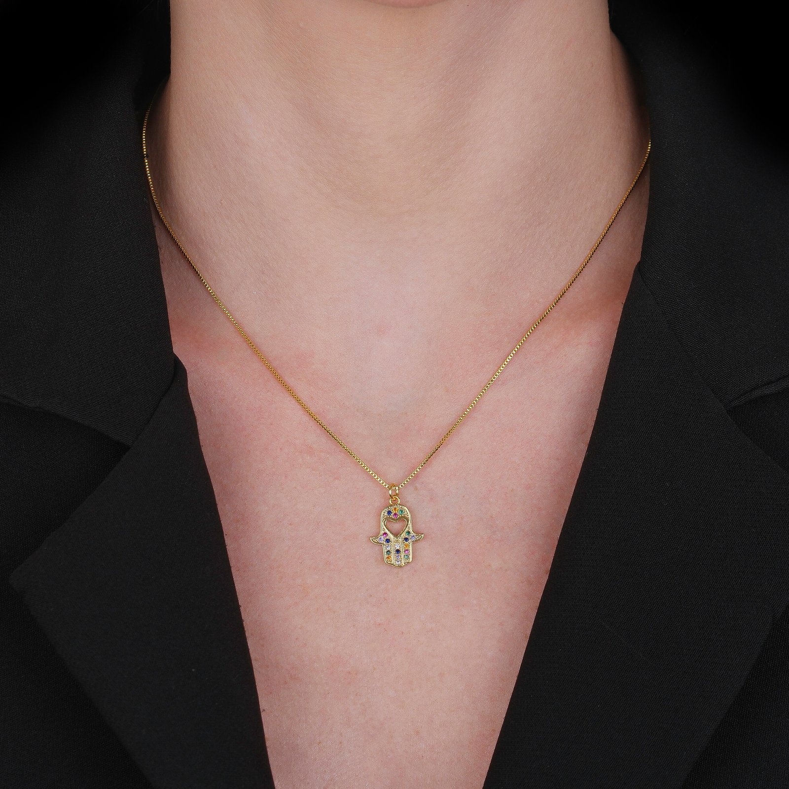 Colar Dourado Mão de Fátima Cravejado de Zircônia Coloridas com Coração